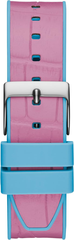 GUESS Fusion is the perfect sport inspired luxury look. The rainbow-like palette highlights the iridescent details and a unique cut through dial with 2 rows of crystals on the 36mm bezel. The vibrant colour blocking strap in pink strap with turquoise silicone accent adds contrast and rounds off this luxe look.Introducing the Guess GW0553L5 Fusion Multi-Function, a vibrant timepiece that combines style with functionality. This watch features a silver stainless steel case with a crystal embellished bezel, adding a touch of glamour to its design. The pink cut-out dial offers a unique and playful aesthetic, complemented by a pink and aqua blue strap that features both leather and silicone for comfort and durability.