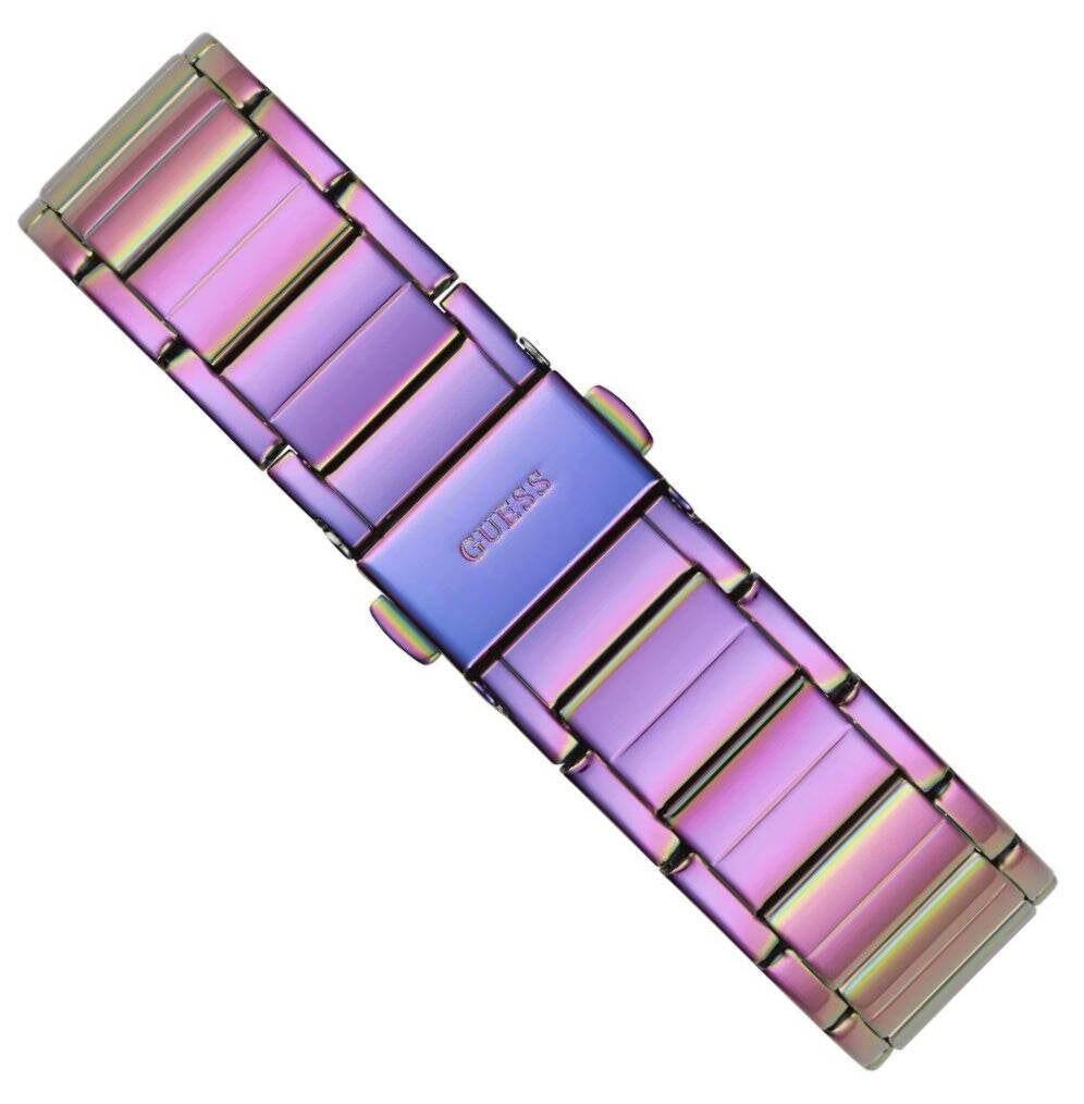 Elevate your style with this stunning Guess Fusion Chronograph Watch for women. The vibrant purple dial, paired with a matching steel strap, makes a bold fashion statement. Perfect for any occasion, this watch offers both style and functionality with its chronograph feature. Stay on time and on trend with Guess Fusion!