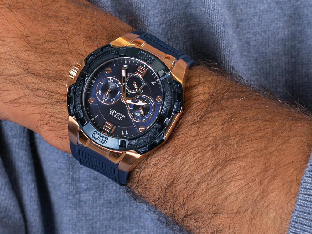 Guess Genesis Men’s Watch Rose gold-tone stainless steel case with a blue silicone strap. Blue bezel. Blue dial with rose gold-tone hands and Arabic numeral hour markers. Quartz movement. It is shipped with its original box and official warranty card.