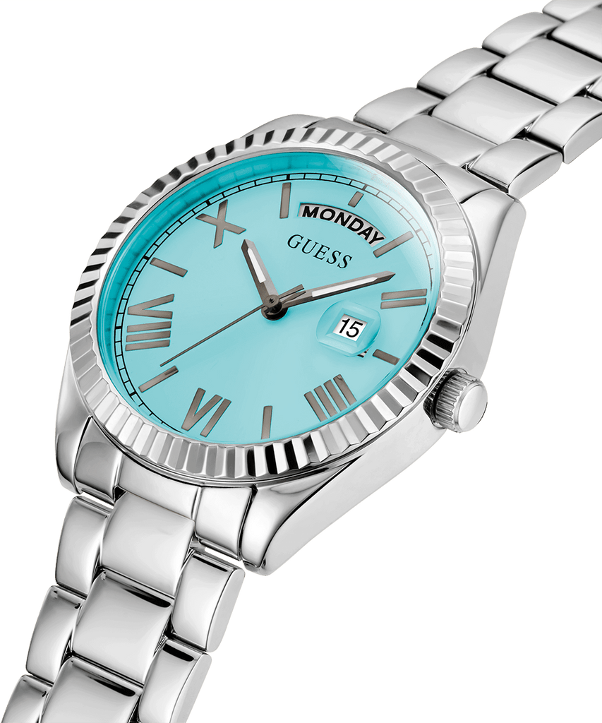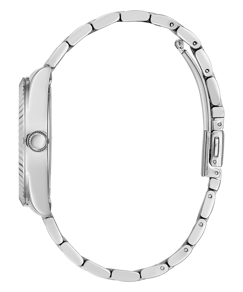 A subtly striking accessory, this smooth silver-tone watch features a textured bezel surrounding an analog dial with Roman numeral markings and day and date functions.