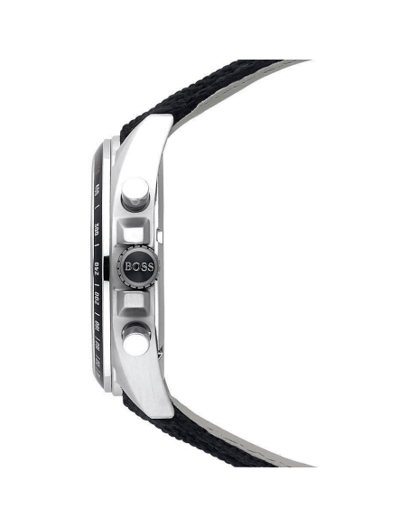 Crafted with a highly durable nylon strap, this watch by BOSS features stainless steel casing around the dial. Three-hand quartz chronograph movement and a date window display complete this water-resistant timepiece.