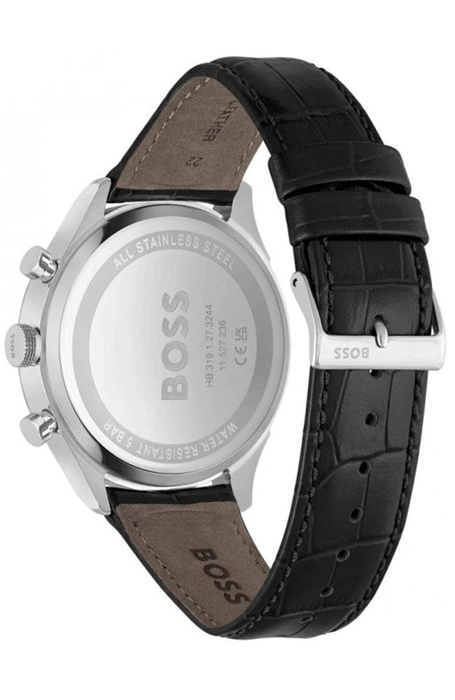 This Hugo Boss Men's Watch exudes effortless class and sophistication with its 45 mm diameter case, 11.8 mm thickness, and black mock crocodile-grained leather strap. The beautiful black sunray dial showcases a quartz fashion chronograph movement and mineral crystal, while remaining 5 ATM water resistant. Enhance your look with the timeless elegance of this quality timepiece.