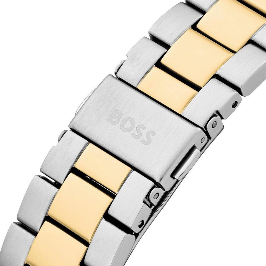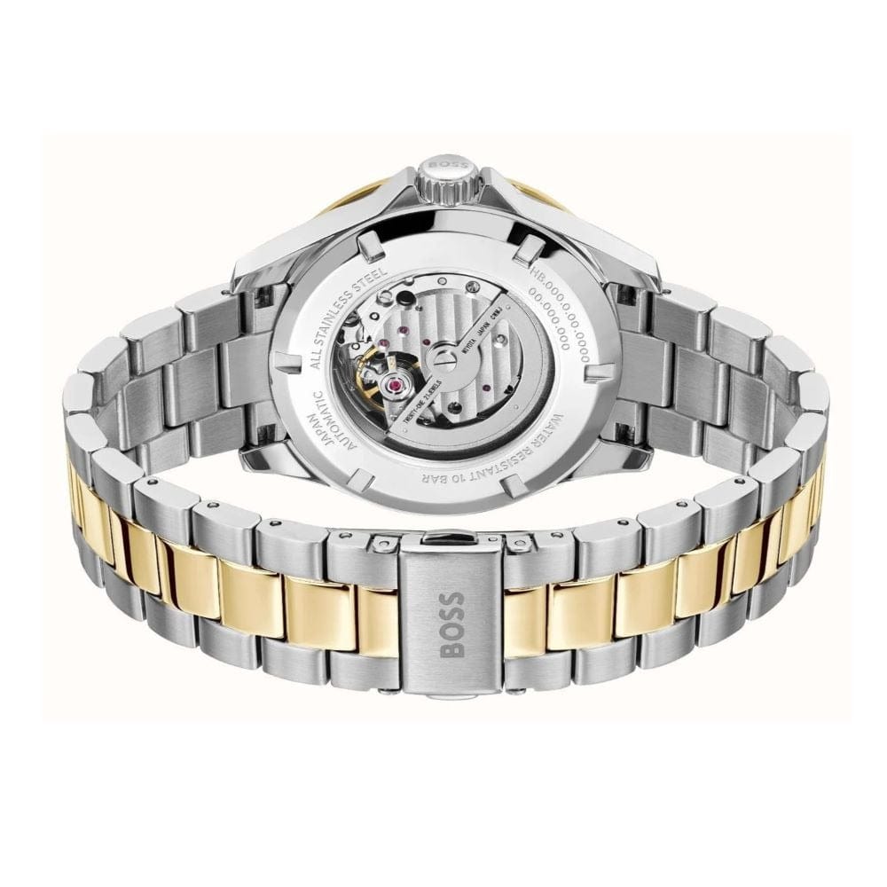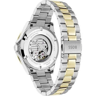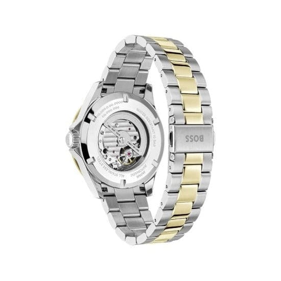 The two-tone BOSS Troper Automatic 1514201 automatic wristwatch combines functionality with sophisticated style, making it a stand-out accessory for any occasion. The case of this automatic watch is 42 mm wide and 12.3 mm thick and made of stainless steel, and through the transparent back case you can admire the automatic movement with 21 jewels. The front also has an open heart.