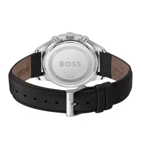 The BOSS Avery 1514156 watch features a round case with a sleek bezel, offering a contemporary look. Its dial includes three subdials, adding functionality and a touch of complexity. The main dial is marked with slender hour indices and matching hands for a harmonious appearance. Two pushers on the right side, along with a ridged crown, highlight its practical design. The watch is styled with a genuine leather strap in black, providing a classic touch.