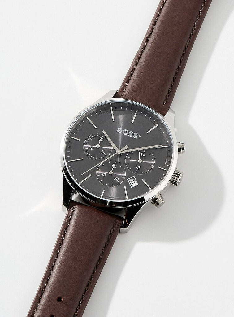 This Hugo Boss men's watch from the Avery collection features a 42 mm stainless steel case. The leather strap is finished with a buckle closure. The gray dial offers excellent readability and is protected by shatterproof mineral glass. Water resistance to 5 bar allows for brief contact with water. The timepiece is equipped with a quartz movement with a date and chronograph function.