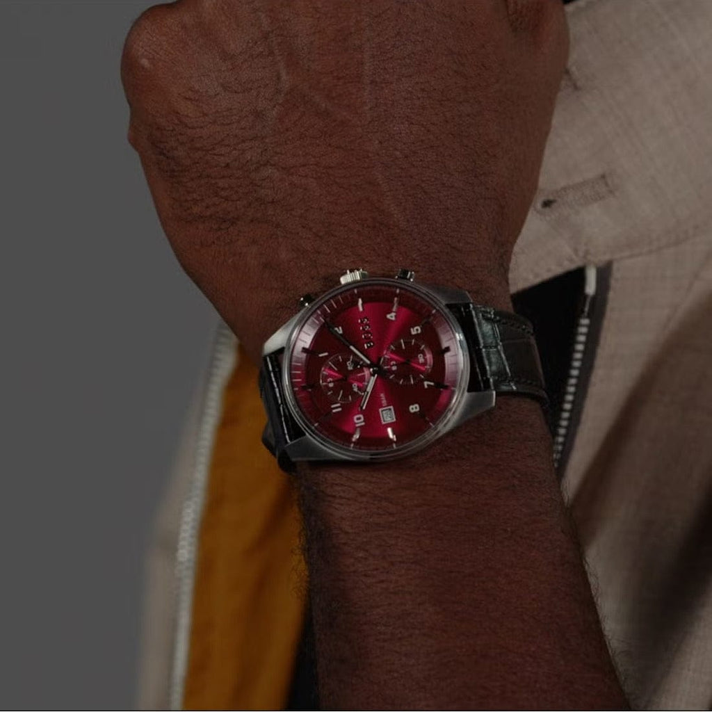 The Hugo Boss Skytraveller Chronograph combines sophisticated style with practical functionality. Featuring a striking burgundy red dial that commands attention, this timepiece is housed in a polished case that exudes premium craftsmanship. The black leather strap adds versatility, transitioning seamlessly from boardroom meetings to weekend adventures.