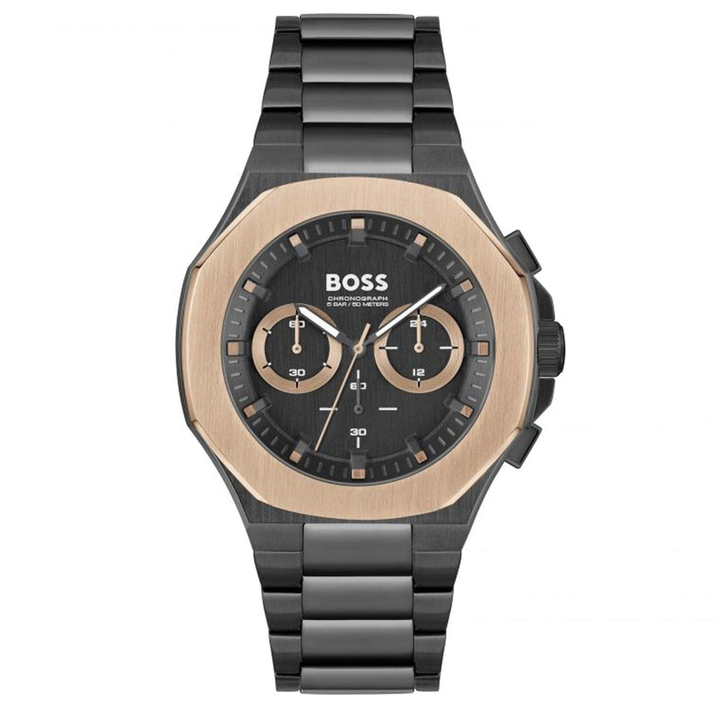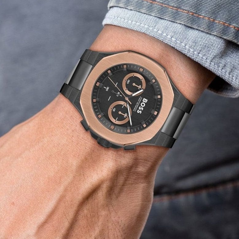 This watch comes from Boss with the 'Taper' watch (1514090) as part of the Sport Lux collection. With modern angular lines and a striking risen matte bronze IP bezel which matches the two accent sub-dials. Bronze is a very in-vogue colour in the watch world at the moment and features heavily within Boss collection across the board. Also offered is the BOSS 'Kane' men’s Jewellery, featuring a matching necklet and bracelet. Featuring a 45mm case and quartz chronograph movement, the watch is made from 316L Stainless steel and combines matte black IP plating to offer a sleek and modern look to the wearer.