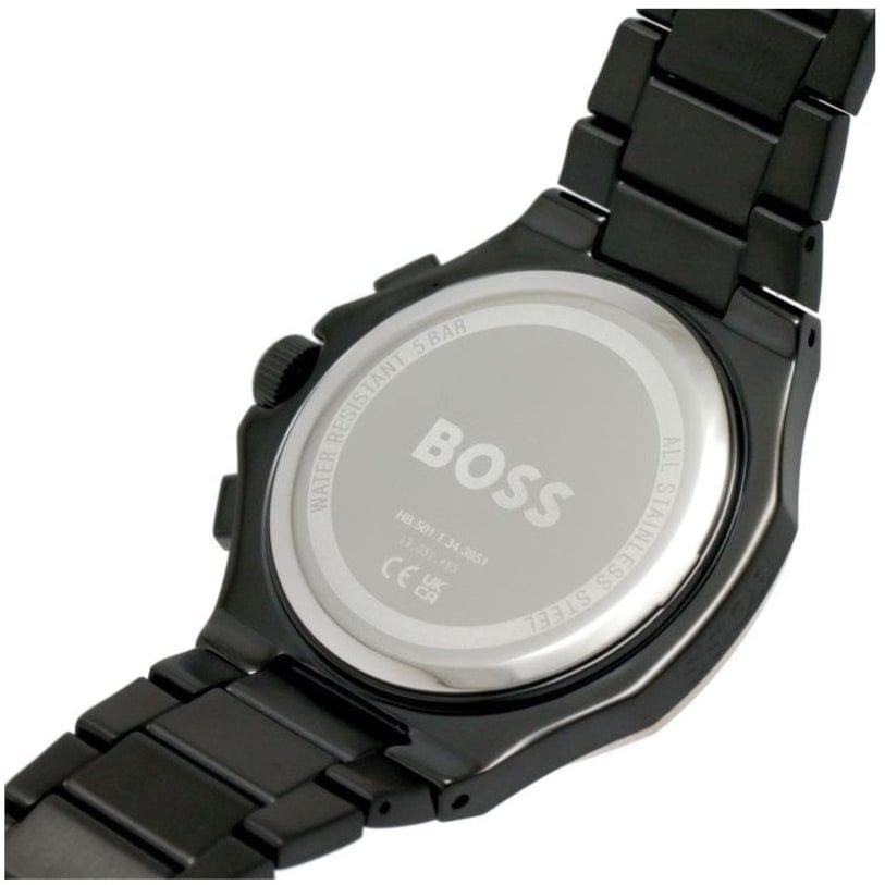 In the centre is the ‘BOSS’ logo which stands out in a bold matte silver. Two chronograph push-buttons at either side of the crown add a sporty element to the angular case and fitted to the case is a black IP bracelet with double push deployment clasp fastening for added security. With all Boss watch purchases, you will receive a two-year warranty and official boss watch gift box packaging.