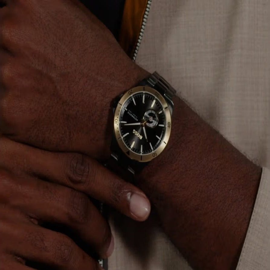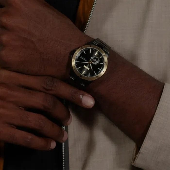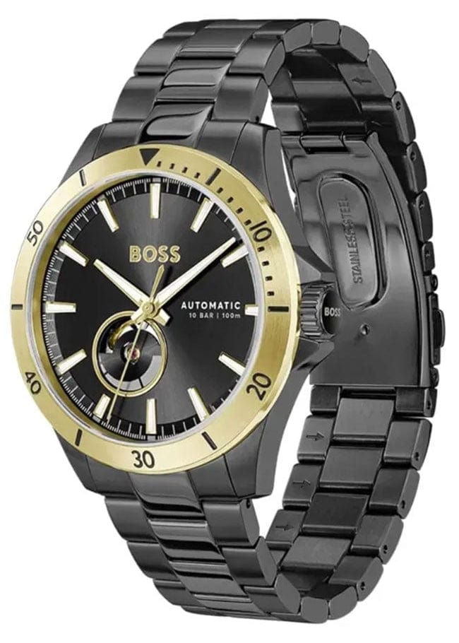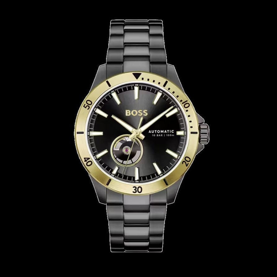 The BOSS Troper Automatic 1514203 is a captivating timepiece that combines bold design with technical precision. It features a round face with a unique circular cut-out on the dial, adding a distinctive touch to its appearance. The watch's open heart and transparent backcase offer a glimpse into the intricate automatic movement, driven by the Miyota 82S0 caliber. The black dial is framed by a gold bezel, creating a striking contrast that enhances its visual appeal.