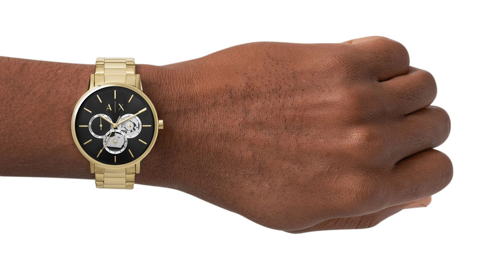 Armani Exchange's 42mm watch features a black skeleton dial, at least 50% recycled stainless steel case, multifunction movement and gold-tone stainless steel bracelet.