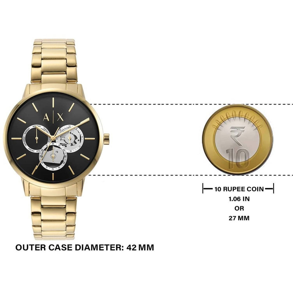 Elevate your style with the Armani Exchange Cayde Chronograph watch for men. With a sleek black dial and elegant gold steel strap, this watch exudes luxury and sophistication. The chronograph feature adds functionality while the durable materials ensure long-lasting wear. Elevate your look and make a statement with the AX2747.
