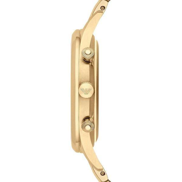Gold-tone stainless steel case and bracelet. Fixed gold-tone bezel. Black dial with gold-tone hands and alternating Arabic numeral and index hour markers. Minute markers around the outer rim. The Emporio Armani logo appears at the 12 o'clock position. Dial Type: Analog. Date display between the 4 and 5 o'clock positions. Chronograph - three sub-dials displaying: 60 seconds, 60 minutes, and 24 hours. Quartz movement. Scratch-resistant mineral crystal. Pull/push crown. Solid case back. Case diameter: 41 mm. Case thickness: 11 mm. Round case shape. Band width: 22 mm. Deployment clasp. Water-resistant at 50 meters / 165 feet. Functions: chronograph, date, hour, minute, second. Casual watch style. Emporio Armani Classic Chronograph Black Dial Gold-tone Stainless Steel Men's Watch AR1893.