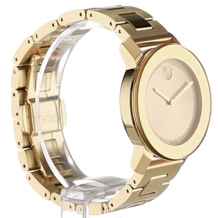 Yellow gold ion-plated stainless steel case and bracelet. Fixed yellow gold ion-plated bezel. Champagne dial with yellow gold-tone hands. No markers. The Movado dot appears at the 12 o'clock position. Dial Type: Analog. Quartz movement. Scratch resistant mineral crystal. Pull / push crown. Solid case back. Case size: 36 mm. Case thickness: 10 mm. Round case shape. Band width: 18 mm. Band length: 8 inches. Deployment clasp with a push button release. Water resistant at 30 meters / 100 feet. Functions: hours, minutes. Dress watch style.