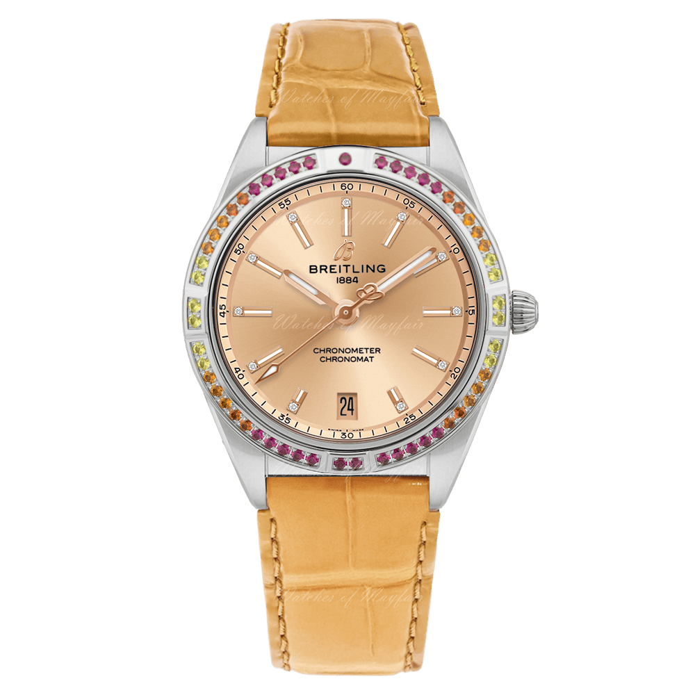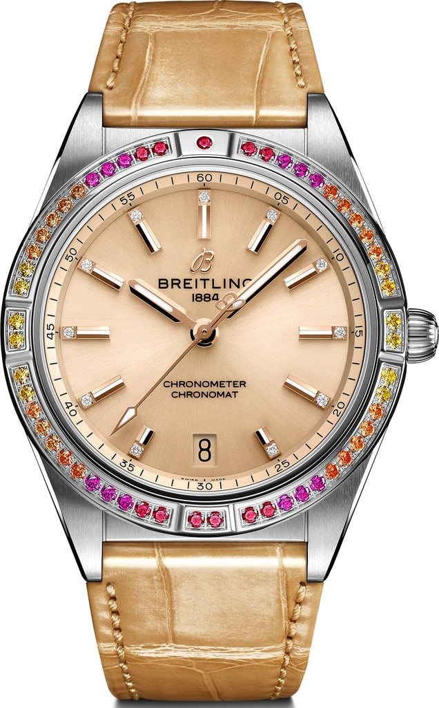 Breitling Chronomat Automatic 36 South Sea watch. Model reference: A10380611A1P1. Stainless steel case set with diamonds. Beige dial. Automatic movement. Beige alligator leather strap with folding clasp. Swiss made. The watch comes in the original packaging, with a set of documents and 2 years warranty.