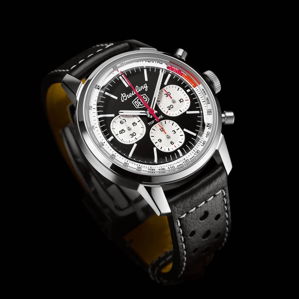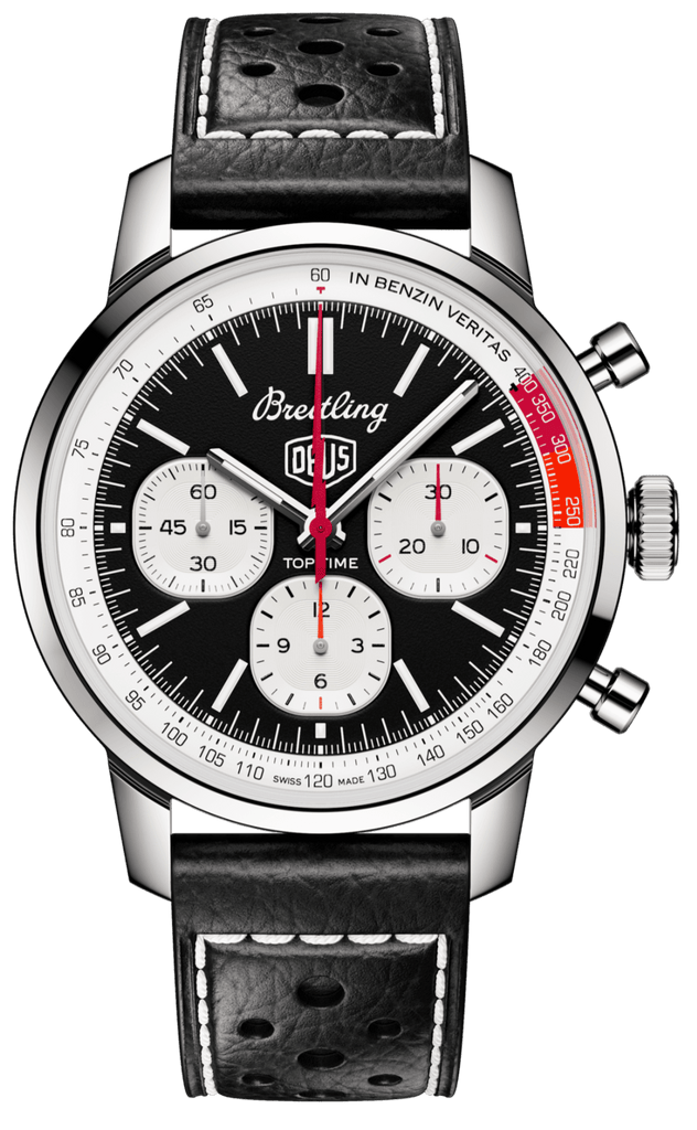 The 1960s was a decade of experimentation, fun, freedom and energy. Whether cruising on a motorcycle or revving up a sportscar, living life at full speed was the order of the day. Willy Breitling felt this change of pace and set out to design an unconventional chronograph that would capture the verve of era. He called it the Top Time. That spirited tradition continues today with Breitling partnering with some of the coolest names in wheels to create its Top Time designs. Co-designed with Australian surf-and-motorcycle outfitter Deus Ex Machina, the Top Time B01 Deus will appeal to bikers, boarders and backpackers, all looking for the freedom to explore the world their own way, at their own pace. It features the Deus emblem and adage “In benzin veritas” on the dial as well a perforated leather racing strap, speed-measuring tachymeter scale and contrasting “squircle” (not quite square, not quite round) subdials that give the feel of a vintage dashboard gauge. It also comes with a special lightning-bolt-shaped chronograph hand and, under the hood, a brag-worthy engine: the exceptional Breitling Manufacture Caliber 01.
