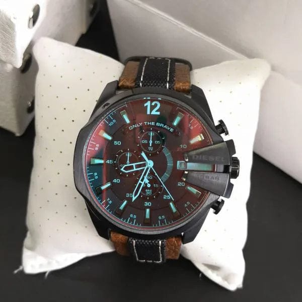 The Diesel DZ4305 Iridescent Red Dial is an ultra-modern watch that’s perfect for the style-minded professional. This metal-plated bezel features a gorgeous brown leather strap with mesh center stripe and comfortable tang clasp. The fixed gunmetal-plated bezel holds a stunning iridescent red dial face, branded by white skeleton hands and numerals along the outer rim.