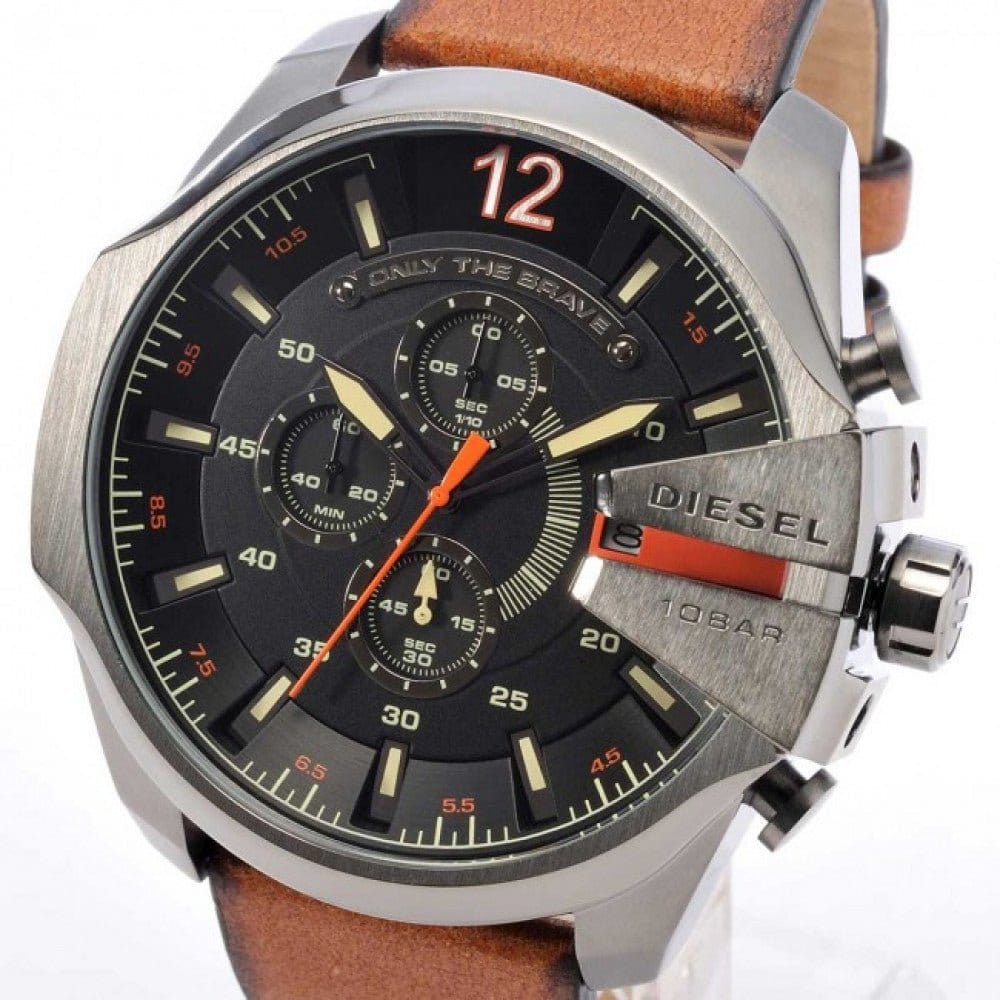 stainless steel case, with a black dial. Brown leather Strap. quartz movement. mineral crystal. 59mmx 51mmx 12mm case. 26mm band width. 100 meters water resistant. Diesel Mega Chief Quartz Chronograph Brown Leather Watch DZ4343