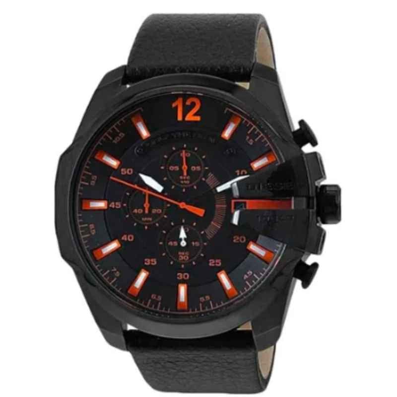 This Diesel Mega Chief DZ4291 comes in black ion-plated stainless steel case with a black leather strap. Fixed black ion-plated bezel. Black dial with orange and black hands and index and Arabic numeral hour markers. Arabic numeral marks the 12 o'clock position. Minute markers around the outer rim. Dial Type: Analog. Luminescent hands and markers. Date display at the 3 o'clock position. Chronograph - three sub-dials displaying: 60 second, 30 minute and 1/10th of a second. Quartz movement. Scratch resistant mineral crystal. Pull / push crown. Solid case back. Case diameter: 51 mm. Round case shape. Tang clasp. Water resistant at 100 meters / 330 feet. Functions: chronograph, date, hour, minute, second. Sport watch style.
