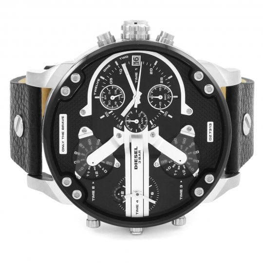 DIESEL Watch collection Mr Daddy 2.0, ref. DZ7313. The case (57 mm) is made of glossy-satin steel with black IP treatment. The multilayer dial, with 'texture' on the black bottom, features transparent black acetate inserts and metal applications, including the Diesel logo plate. This watch has 4 time zones with quartz movement, one of which has chronographic functions of hours, minutes, seconds, and more. Waterproof up to 3 ATMs. Glass in mineral crystal. Black leather strap with personalized buckle closure.