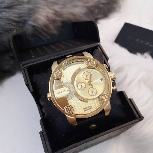 This Diesel Mr Daddy DZ7363 Dual Zone Men's watch comes with a gold-tone stainless steel case with a black leather strap. Fixed gold-tone bezel. Champagne dial with gold-tone hands and index hour markers. Scratch resistant mineral crystal. Solid case back. Case dimensions: 51 mm x 61 mm. Case thickness: 13 mm. Band width: 24 mm. Tang clasp. Water resistant at 30 meters / 100 feet.