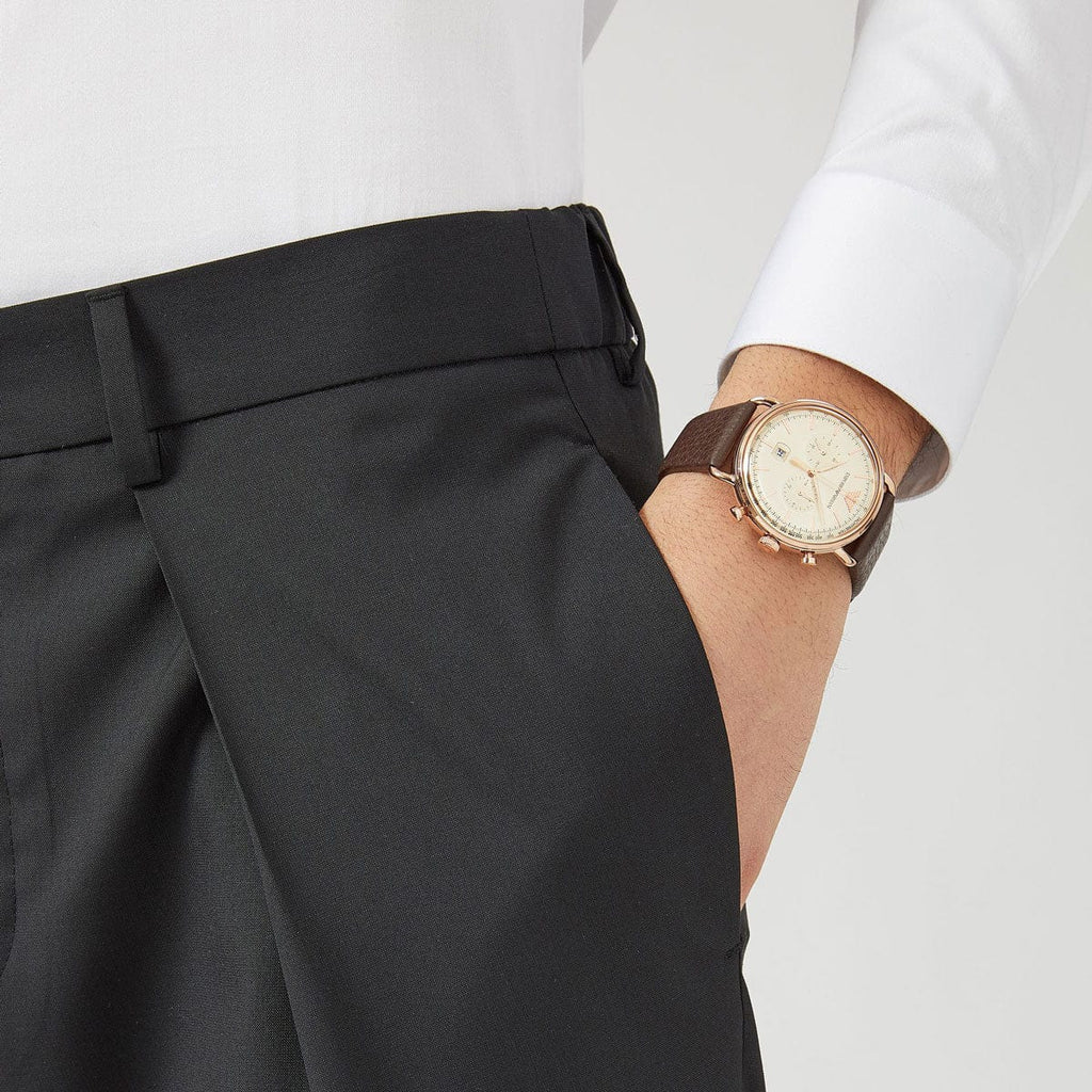 This classy men's watch from Emporio Armani features a rose gold plated 43 x 12mm case with matching chronograph dials, hands and hour markers. There is also a date display box and the watch is finished with a 22mm brown leather strap with buckle and has 50m water resistance.