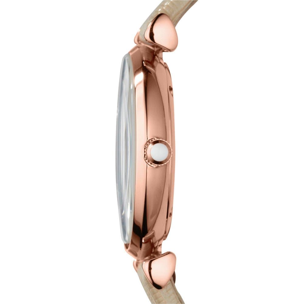 Fashion meets function with this stunning watch from Emporio Armani. The Rose Gold Stainless Steel case features a Rose Gold and Beige crystal set dial. The Beige Genuine Leather bracelet adds the finishing touch.