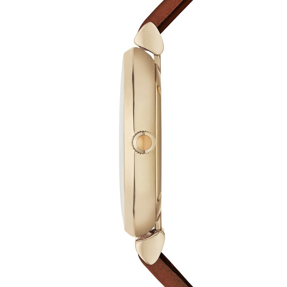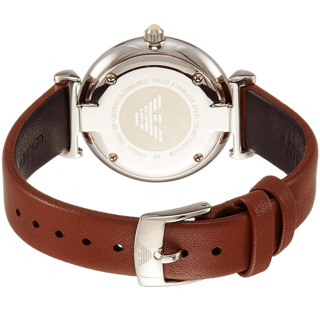 Emporio Armani AR1960 Watch A brown leather strap accents the gold-tone case of this Emporio Armani womens watch. The coral mother-of-pearl dial features gold-tone accents, crystal indexes, and the EA logo. This tonal combination correlates to the seasonal colors seen in the Emporio Armani ready to wear collections.