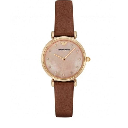 Gold-tone stainless steel case with a brown leather strap. Fixed gold-tone bezel. Pink mother of pearl dial with gold-tone hands and crystal hour markers. The Emporio Armani logo appears on the 12 o'clock position. Dial Type: Analog. Quartz movement. Scratch resistant mineral crystal. Pull / push crown.