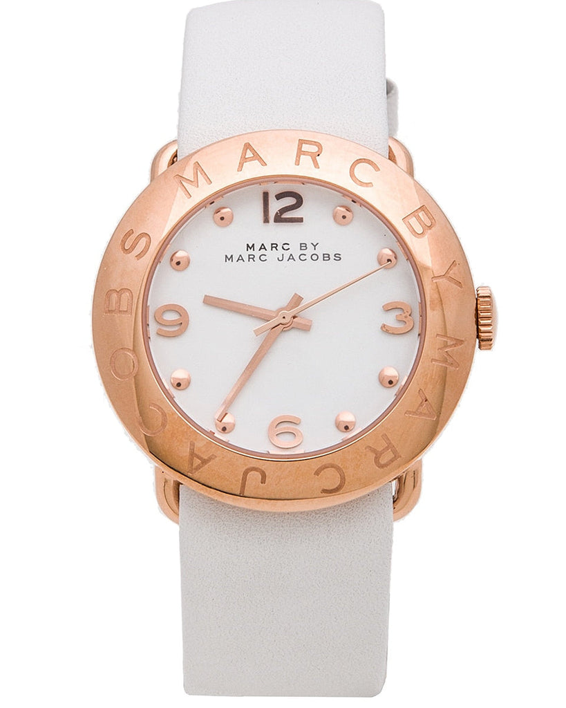 Stainless steel case with a white leather strap. Fixed rose gold-plated bezel. White dial with rose gold-tone hands and dot hour markers. Arabic numerals mark the 3, 6, 9 and 12 o'clock positions. Dial Type: Analog. Quartz movement. Scratch resistant mineral crystal. Pull / push crown. Solid case back. Case diameter: 36 mm. Case thickness: 12 mm. Round case shape. Band width: 16 mm. Band length: 6 inches. Tang clasp. Water resistant at 30 meters / 100 feet. Functions: hour, minute, second. Casual watch style. Marc by Marc Jacobs Amy White Dial White Leather Ladies Watch MBM1180.