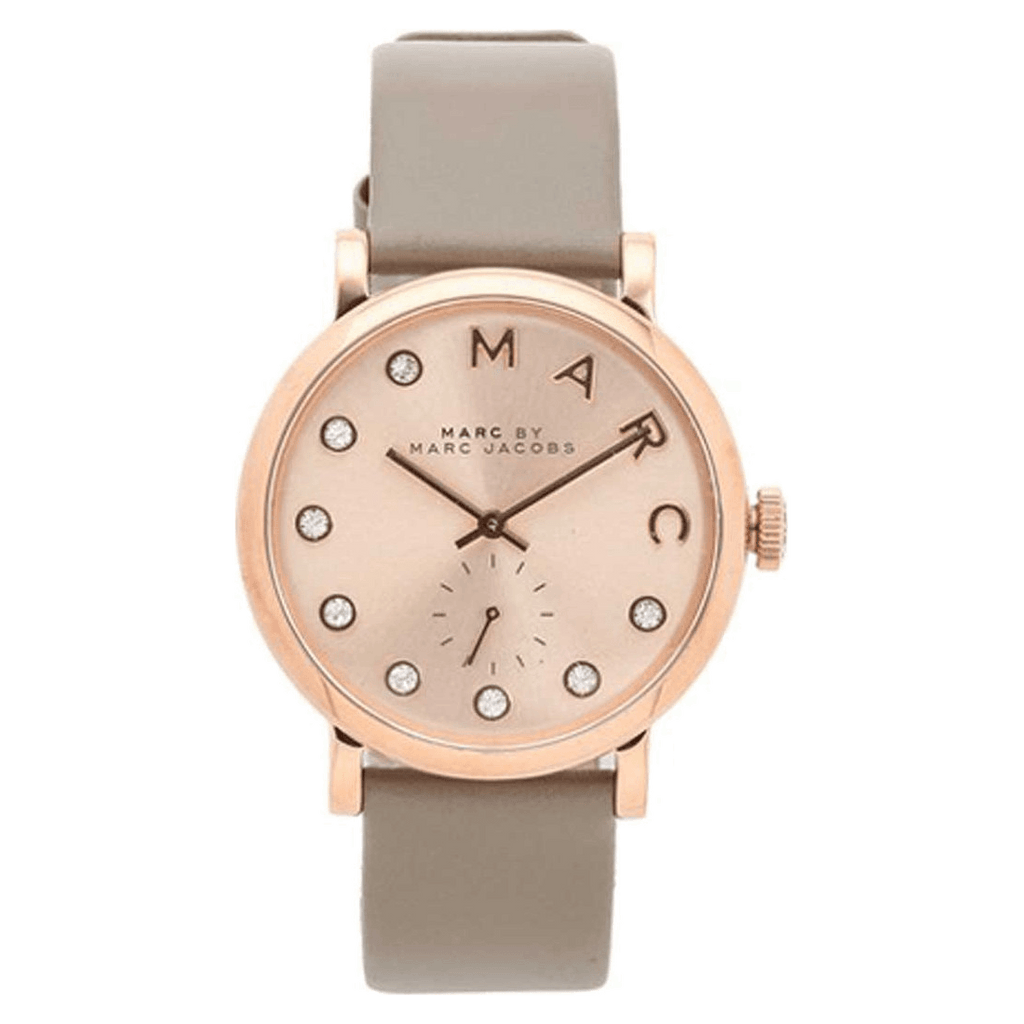 Rose gold-tone stainless steel case with a grey leather strap. Fixed rose gold-tone bezel. Rose gold dial with rose gold-tone hands and faux diamond hour markers. Dial Type: Analog. Seconds sub-dial at the 6 o'clock position. Quartz movement. Scratch resistant mineral crystal. Push / pull crown. Solid case back. Case diameter: 36 mm. Case thickness: 8 mm. Round case shape. Band width: 18 mm. Tang clasp. Water resistant at 50 meters / 165 feet. Functions: hour, minute, second. Casual watch style. Marc By Marc Jacobs Baker Rose Gold Dial Grey Leather Ladies Watch MBM1400.
