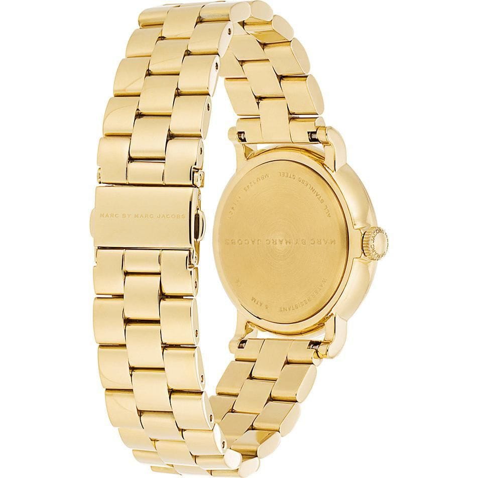 Solid case back. Case diameter: 36.5 mm. Round case shape. Band width: 18 mm. Deployment clasp. Water resistant at 50 meters / 165 feet. Functions: hour, minute, small second. Casual watch style. Marc by Marc Jacobs White Dial Gold-tone Ladies Watch MBM3243.