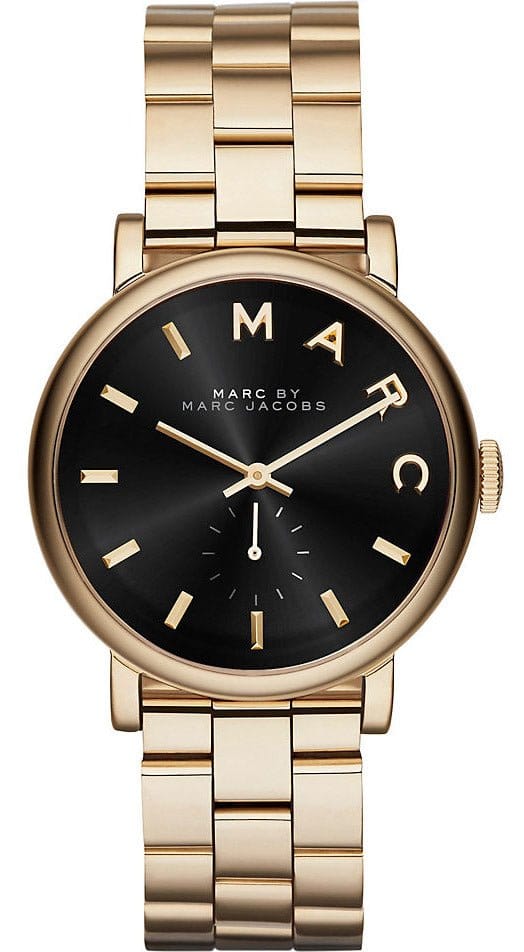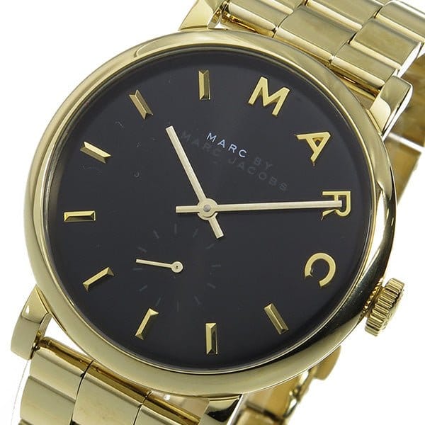 Marc Jacobs Baker Black Dial Gold-tone 36mm Ladies Watch comes in gold-tone stainless steel case and bracelet. Fixed gold-tone bezel. Black dial with gold-tone hands and index hour markers. Dial Type: Analog. Seconds sub-dial at the 6 o'clock position. Quartz movement. Scratch-resistant mineral crystal. Pull/push crown. Solid case back. Case diameter: 36 mm. Case thickness: 6.2 mm. Round case shape. Deployment clasp. Water-resistant at 50 meters / 165 feet. Functions: hour, minute, second. Casual watch style.