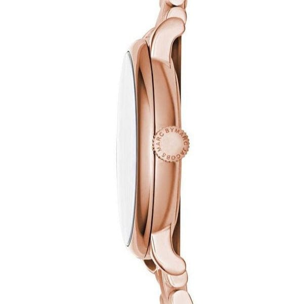Rose gold-tone stainless steel case and bracelet. Fixed rose gold-tone bezel. White dial with rose gold-tone hands and letters and crystals hour markers. 60 seconds sub-dial at the 6 o'clock position. Quartz movement. Pull / push crown. Solid case back. Case diameter: 36 mm. Case thickness: 8 mm. Round case shape. Band width: 18 mm. Deployment clasp with push button release. Water resistant at 50 meters / 165 feet. Functions: hour, minute, second. Casual watch style. Marc by Marc Jacobs Baker White Dail Rose Gold- tone Stainless Steel Ladies Watch MBM3441.| Analogue / Digital | Analogue |