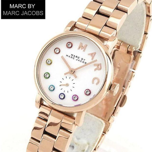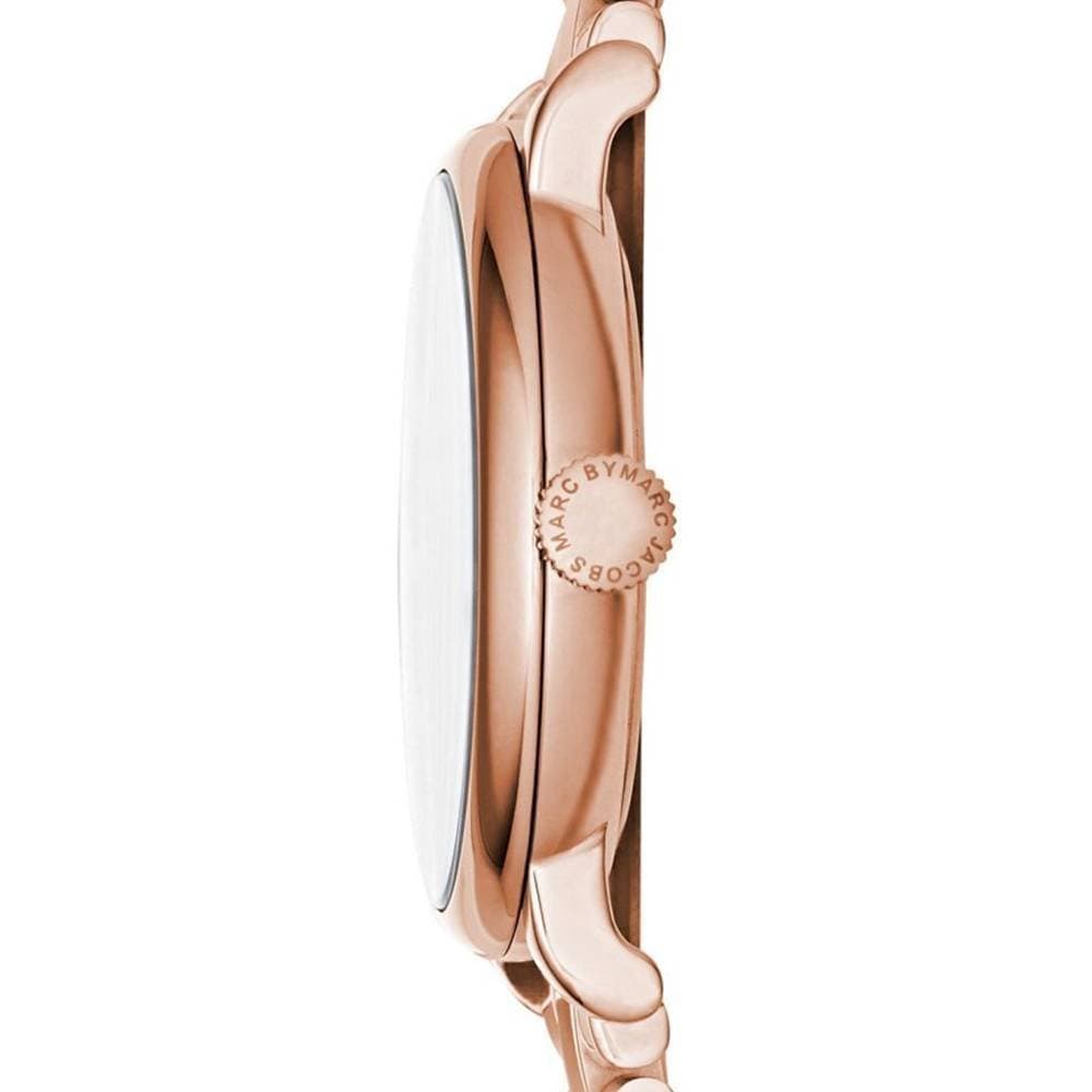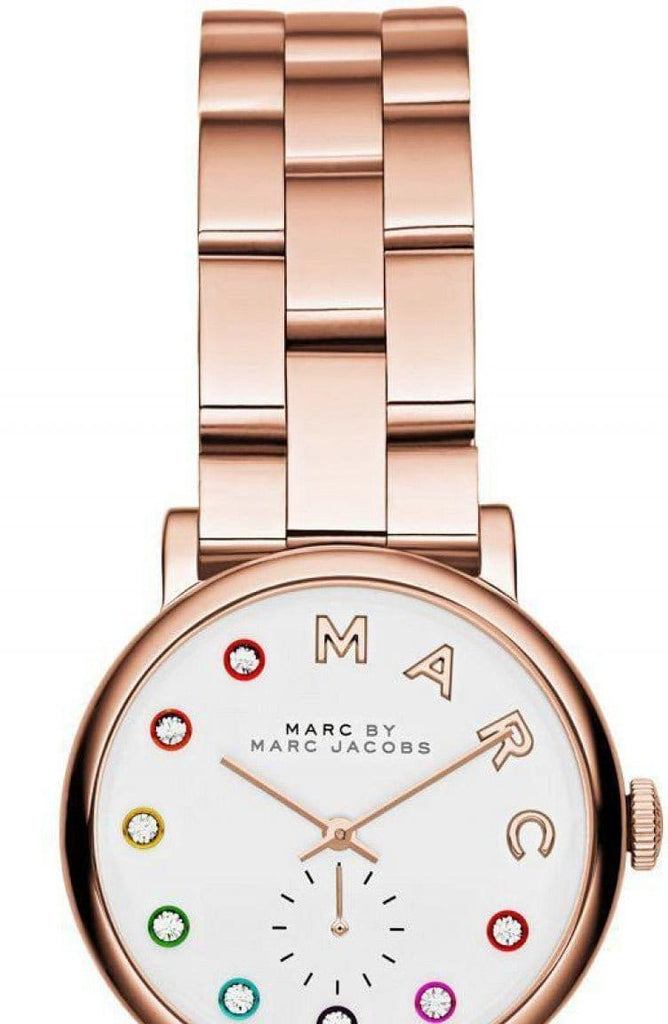 Rose gold-tone stainless steel case and bracelet. Fixed rose gold-tone bezel. White dial with rose gold-tone hands and crystal hour markers. Dial Type: Analog. Seconds sub-dial at the 6 o'clock position. Quartz movement. Scratch resistant mineral crystal. Pull / push crown. Solid case back. Case size: 28 mm. Case thickness: 6 mm. Round case shape. Band width: 12 mm. Fold over clasp. Water resistant at 50 meters / 165 feet. Functions: hour, minute, second. Dress watch style. Marc by Marc Jacobs Baker Dexter White Dial Ladies Dress Watch MBM3443.