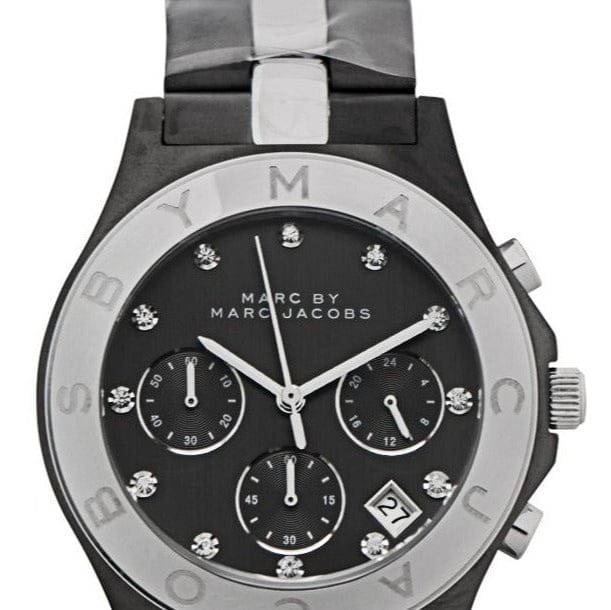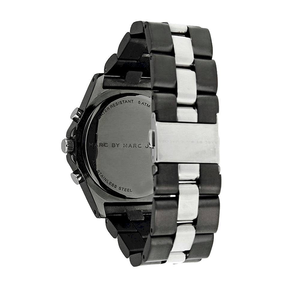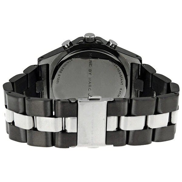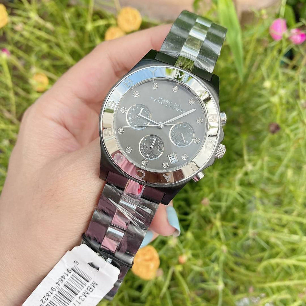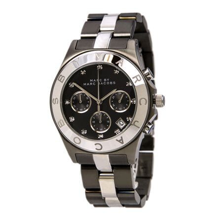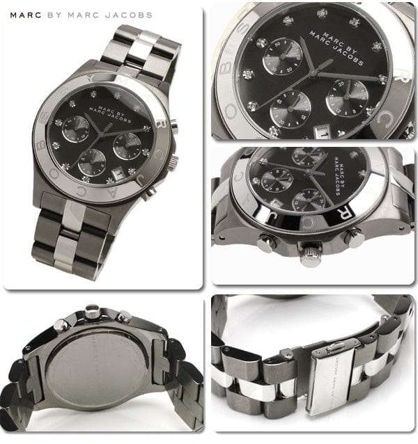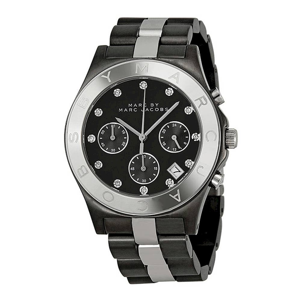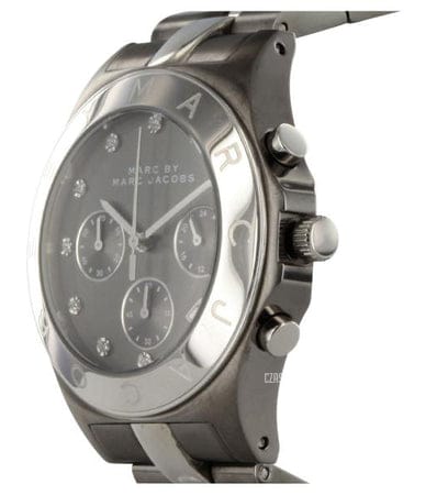 Gunmetal-tone stainless steel case with a two-tone (gunmetal and silver-tone) stainless steel bracelet. Fixed gunmetal-tone bezel. Gunmetal-tone dial with silver-tone hands and crystal hour markers. Dial Type: Analog. Date display appears between the 4 and 5 o'clock positions. Chronograph - three sub-dials displaying: 60 second, 60 minute and 24 hour. Quartz movement. Scratch resistant mineral crystal.Pull / push crown. Solid case back. Case diameter: 40 mm. Case thickness: 12 mm. Round case shape. Band width: 20 mm. Deployment clasp with push button. Water resistant at 50 meters / 165 feet. Functions: chronograph, date, hour, minute, second. Dress watch style. Marc Jacobs Blade Chronograph Gunmetal and Silver-Tone Ladies Watch MBM3179.