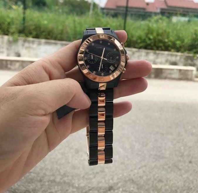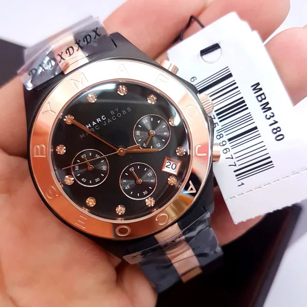 A beautiful Ladies Marc By Marc Jacobs MBM3180 Blade watch in black ion and rose plated stainless steel. This stylish wrist watch has a black dial and comes with a date function, chronograph and sparkling stone hour markers. It is powered by a quality quartz movement and fastens with a two tone stainless steel bracelet. Presented in a signature Marc By Marc Jacobs watch gift box.INFORMATION | |
