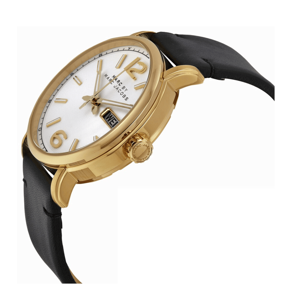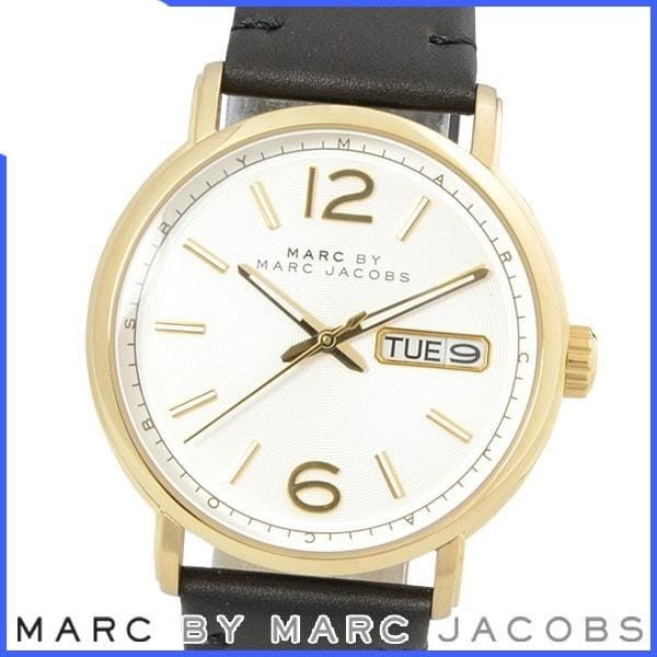Gold-tone stainless steel case with a black leather strap. Fixed gold-tone bezel. White dial with gold-tone hands and index hour markers. Arabic numerals mark the 6 and 12 o'clock positions. Minute markers around the outer rim. Dial Type: Analog. Day of the week and date display at the 3 o'clock position. Quartz movement. Screw down crown. Solid case back. Case diameter: 42 mm. Case thickness: 12 mm. Round case shape. Band width: 22 mm. Tang clasp. Water resistant at 100 meters / 330 feet. Functions: date, day, hour, minute, second. Casual watch style. Marc by Marc Jacobs White Dial Men's Quartz Watch MBM5081.The Marc by Marc Jacobs MBM5081 White Dial Quartz Watch is a fashion-forward timepiece that will have you looking stylish and sophisticated. The simple dial has gold tone accents, and the high quality quartz movement keeps this watch running flawlessly. The Marc by Marc Jacobs watch also includes day of the week and date display at 3:00, minute markers around the outer rim, a screw down crown and solid case.