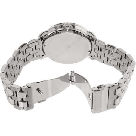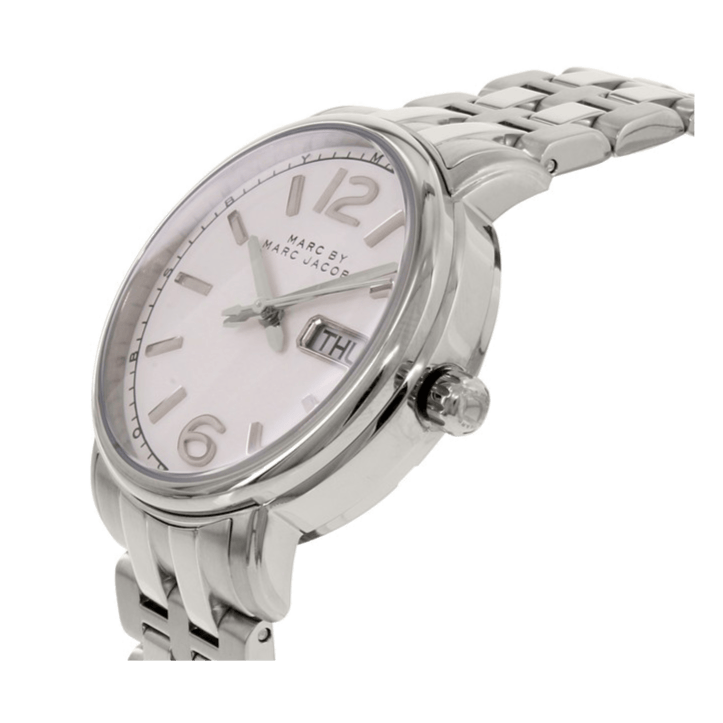 Stainless steel case with a stainless steel bracelet. Fixed bezel. White dial with silver-tone hands and index/ Arabic numeral hour markers. Minute markers around the outer rim. Dial Type: Analog. Date and day display at the 3 o'clock position. Quartz movement. Scratch resistant mineral crystal. Pull / push crown. Solid case back. Case diameter: 38 mm. Case thickness: 8 mm. Round case shape. Band width: 18 mm. Band length: 8 inches. Deployment with push button clasp. Water resistant at 50 meters / 165 feet. Functions: date, day, hour, minute, second. Dress watch style. Marc by Marc Jacobs Fergus White Dial Stainless Steel Ladies Watch MBM8646.| INFORMATION | |