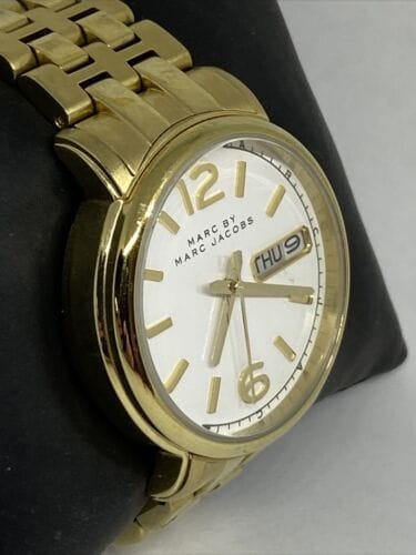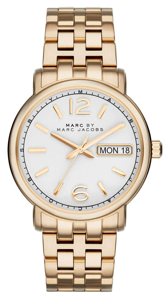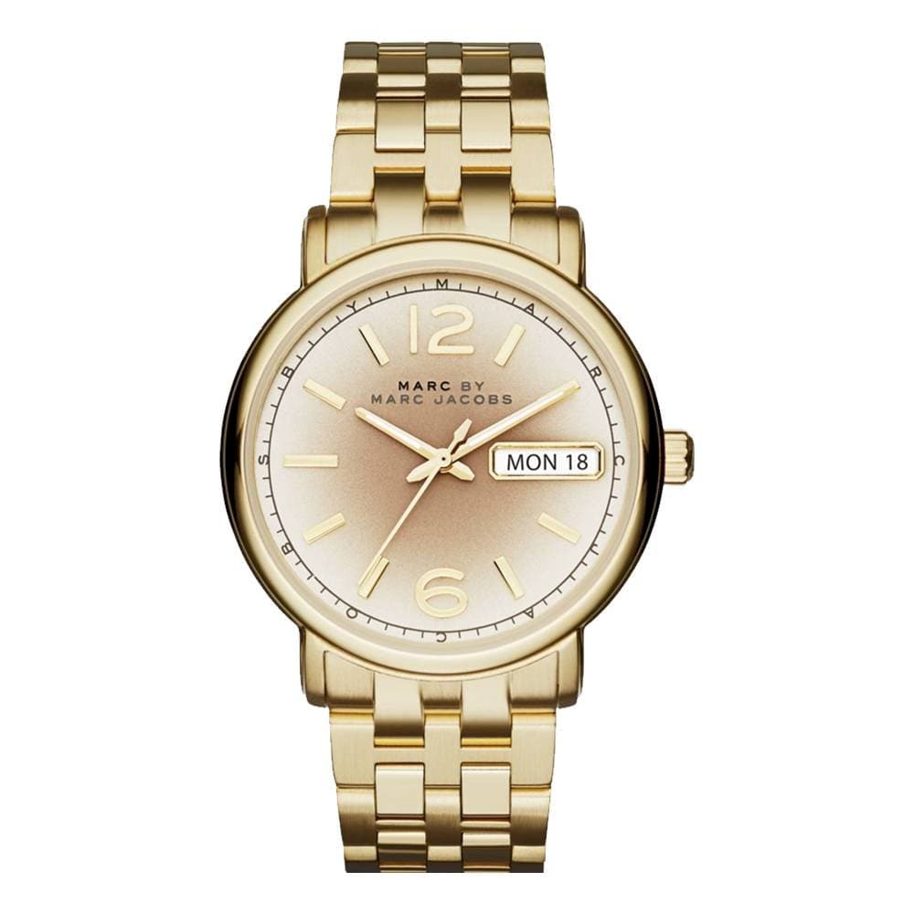Yellow gold-tone stainless steel case and bracelet. Fixed yellow gold-tone bezel. White dial with yellow gold-tone hands and index hour markers. Arabic numerals mark the 6 and 12 o'clock positions. Minute markers around the outer rim. Dial Type: Analog. Date and day of the week display at the 3 o'clock position. Quartz movement. Scratch resistant mineral crystal. Pull / push crown. Solid case back. Case size: 38 mm. Case thickness: 8 mm. Round case shape. Band width: 18 mm. Band length: 8 inches. Deployment clasp. Water resistant at 100 meters / 330 feet. Functions: date, day, hour, minute, second. Casual watch style. Marc by Marc Jacobs Fergus White Dial Ladies Watch MBM8647.Great for going out or just hanging out this Fergus watch by Marc By Marc is the perfect complement to your wardrobe. The white dial really pops and is shelled by a strong mineral crystal and sturdy 38MM stainless steel case. The gold stainless-steel band will stay fastened without irritating your wrist making this watch perfect for everyday wear.