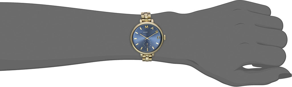 Gold-tone stainless steel case and bracelet. Fixed gold-tone bezel. Blue dial with gold-tone hands and index hour markers. Dial Type: Analog. Seconds sub-dial at the 6 o'clock position. Quartz movement. Scratch resistant mineral crystal. Pull / push crown. Solid case back. Case diameter: 36 mm. Case thickness: 8 mm. Round case shape. Band width: 11.5 mm. Band length: 7 inches. Deployment clasp with push button release. Water resistant at 50 meters / 165 feet. Functions: hour, minute, second. Casual watch style. Marc by Marc Jacobs Sally Blue Dial Gold-tone Ladies Watch MBM3366.