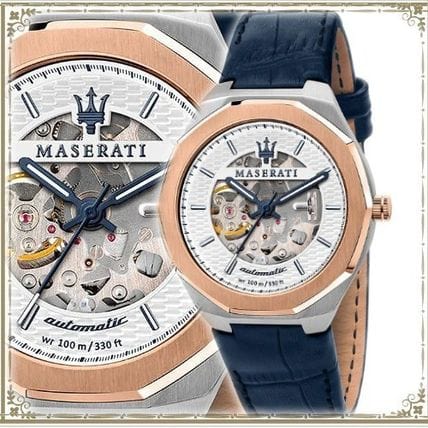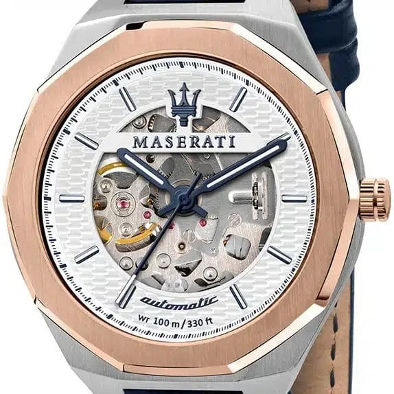 Maserati Stile R8821142001 - a unique gents watch from the Stile collection, featuring a stainless steel case, contrasting rose tone bezel and blue leather strap. Look a little closer at the skeleton dial and you'll note the sleek inner workings of the watch. An eye-catching design from Maserati.
