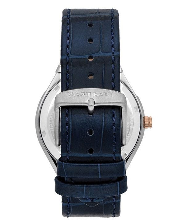 Elegant, lightweight, time only. Automatic Stile Watch - Blue leather strap. The Tridente timepieces embody all of Maserati’s technical expertise and masterful design. Exclusive and inimitable models, with a rigorous design and exceptional functions. The watch case is made of stainless steel.