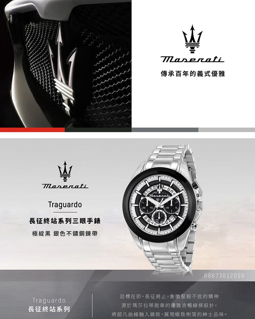 Introducing the Maserati Traguardo Chronograph watch for men. This sleek watch features a black dial and silver steel strap, exuding sophistication and style. Keep track of time in style and elevate your fashion game with this must-have accessory.