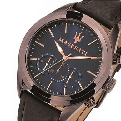 The model is on a brown strap made of leather. The strap is very durable and comfortable to wear. A mineral crystal provides a great protection against shocks and scratches and perfectly goes with the navy blue case. The watch with 100 meters of water resistance means you don't have to take your watch off when swimming or freediving. Maserati R8871612008 is an authentic watch covered by the manufacturer's warranty.