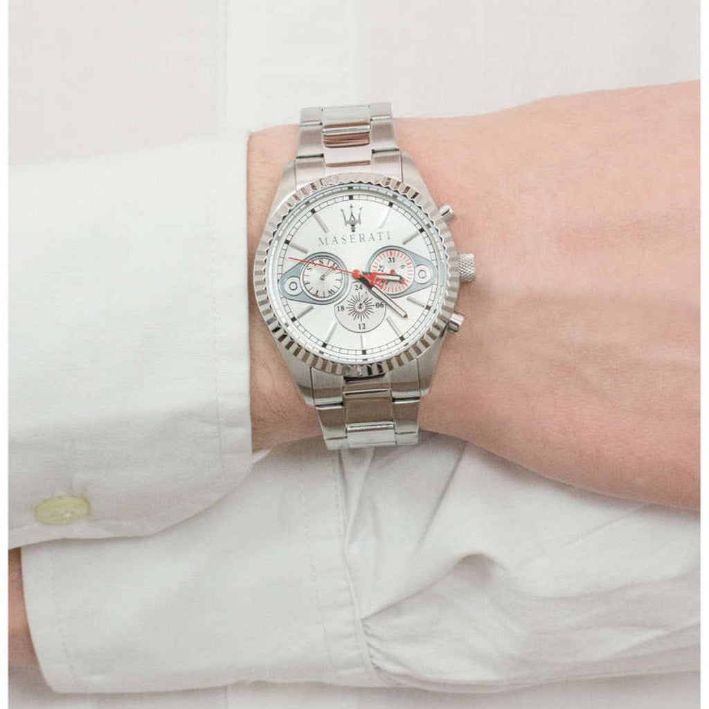 Experience elegance with the Maserati Competizione Chronograph Watch. With its striking white dial and silver steel strap, this watch is the perfect accessory for any stylish man. Featuring a reliable chronograph and the iconic Maserati logo, you'll make a statement wherever you go.