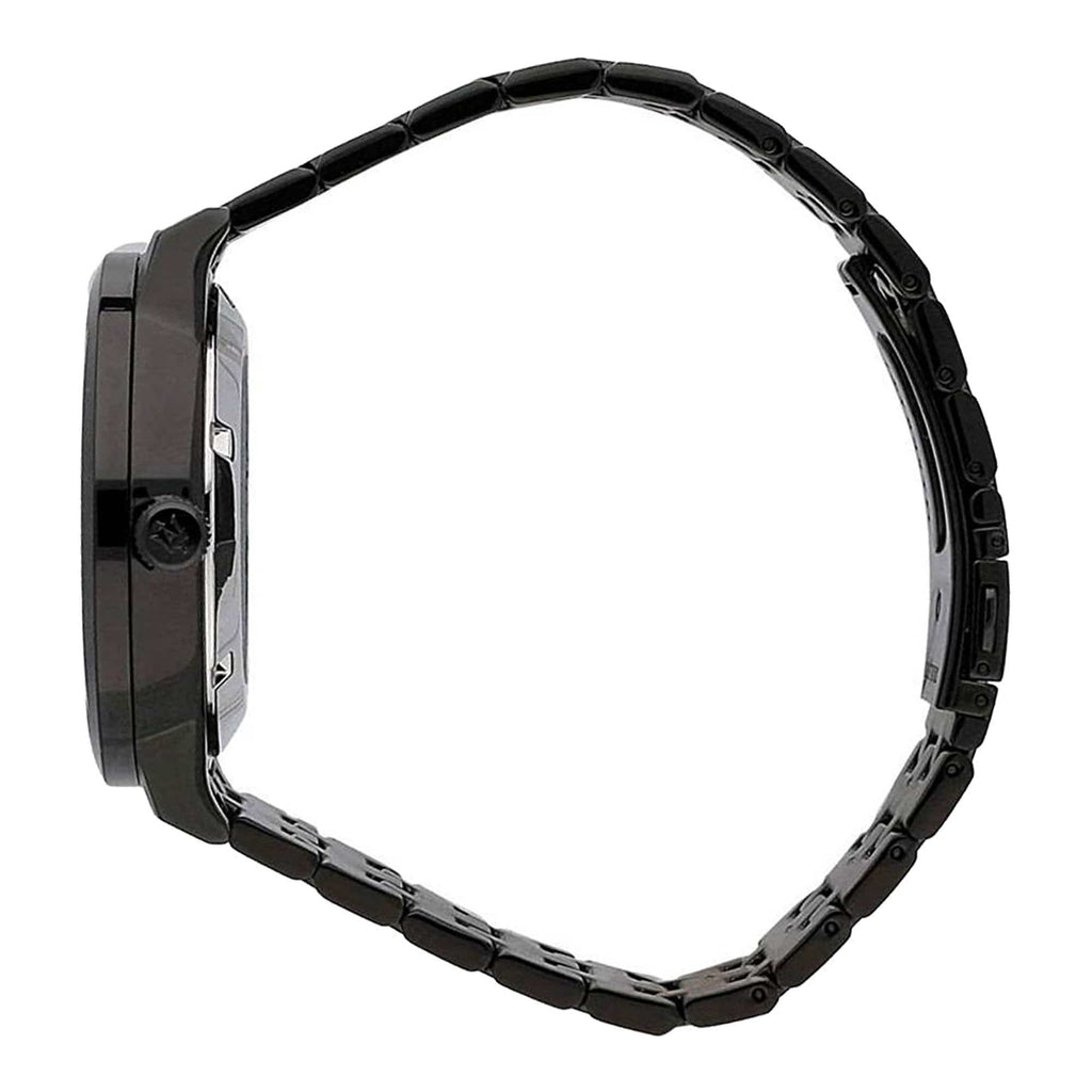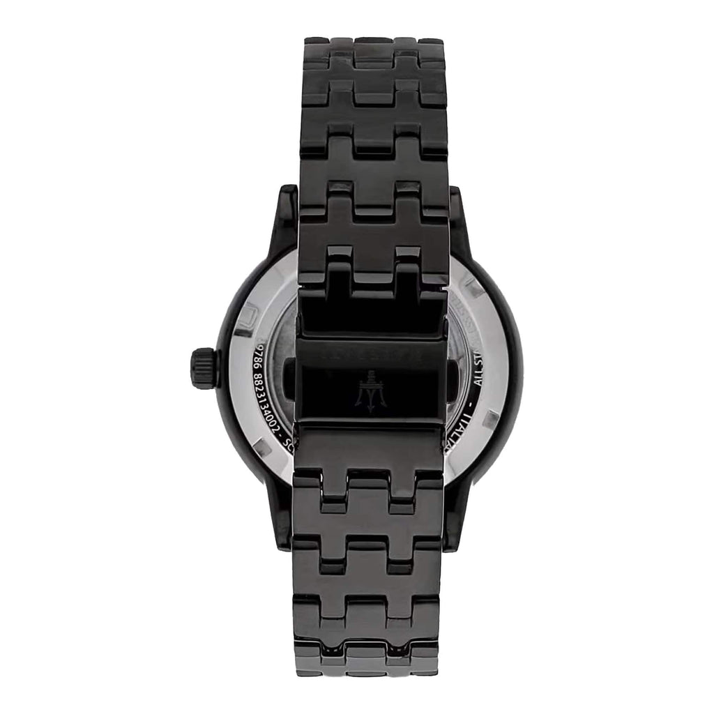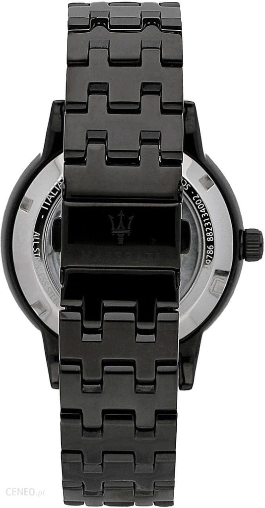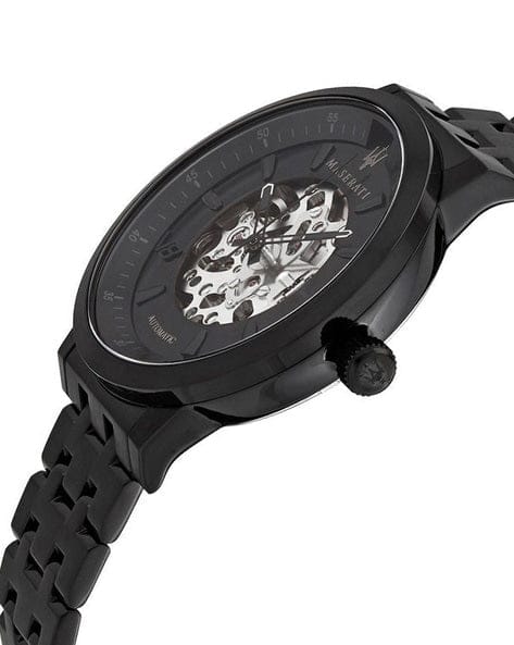 Black stainless steel case with a black stainless steel bracelet. Fixed stainless steel bezel. Black skeleton dial with luminous black hands and index hour markers. Minute markers around the outer rim. Dial Type: Analog. Luminescent hands and markers. Automatic movement. Scratch resistant mineral crystal. Transparent case back. Round case shape, case size: 44 mm, case thickness: 13 mm. Water resistant at 100 meters / 330 feet. Functions: hour, minute, second. Casual watch style. Maserati Automatic Mens Watch R8823134003.