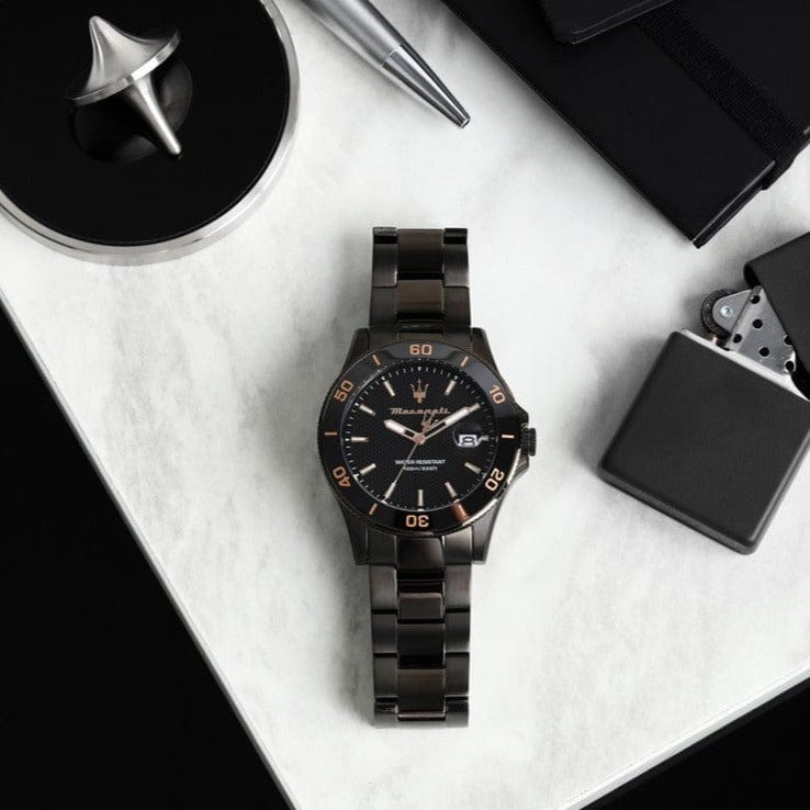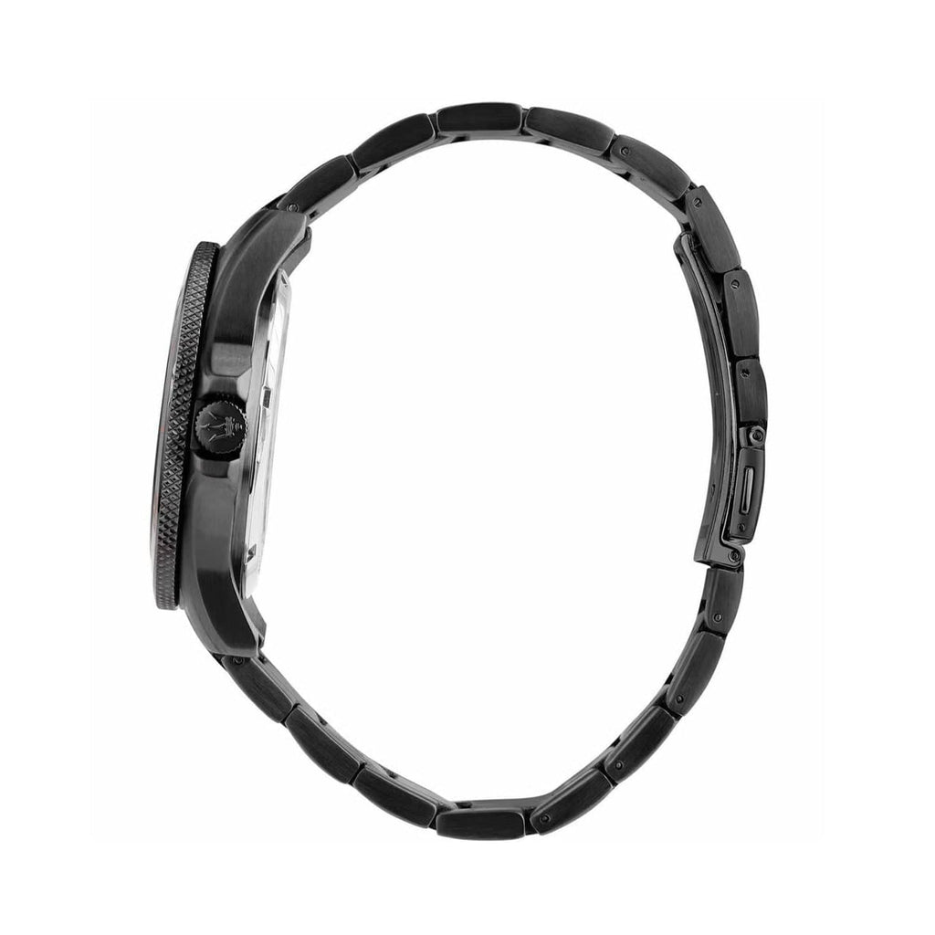 The Maserati Competizione R8853100035 men's watch operates on a Miyota 2315 Japanese quartz movement. The black PVD-coated envelope houses a black dial complemented by a magnifying glass day-of-the-month date stamp and luminescent coating on the indexes and hands. The model features a ceramic rotating bezel. Water resistance is estimated at 10 ATM.