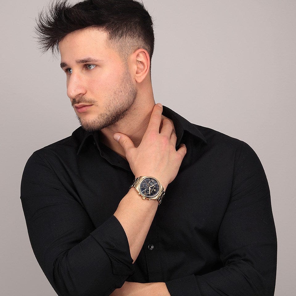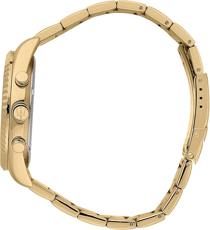 Maserati Chronograph Men's Watch from the Competizione collection, has a yellow gold pvd steel case, with a diameter of 43mm and a thickness of 11.20mm. The strap is in yellow gold pvd steel, with a screw-down case back and crown. The dial is blue with stick indexes. Pilot clasp and water resistance of 10 atm.
