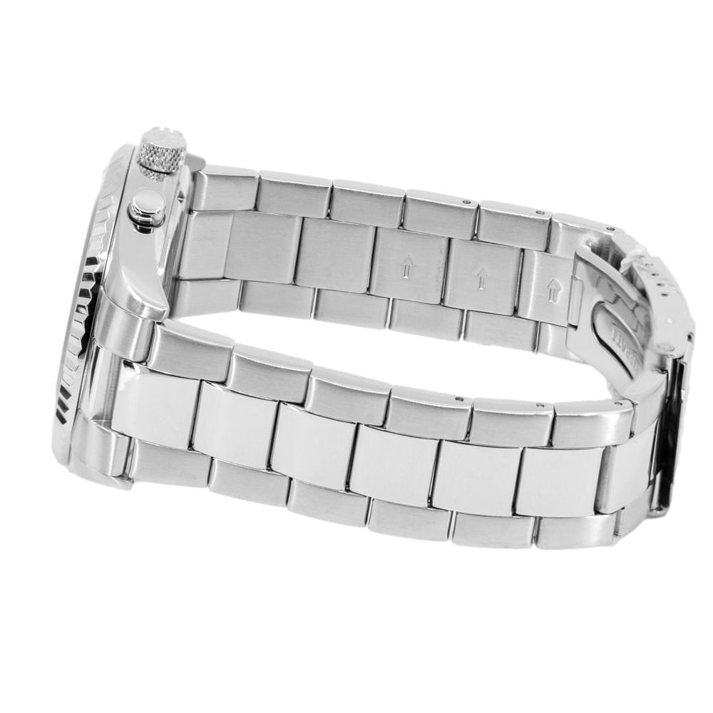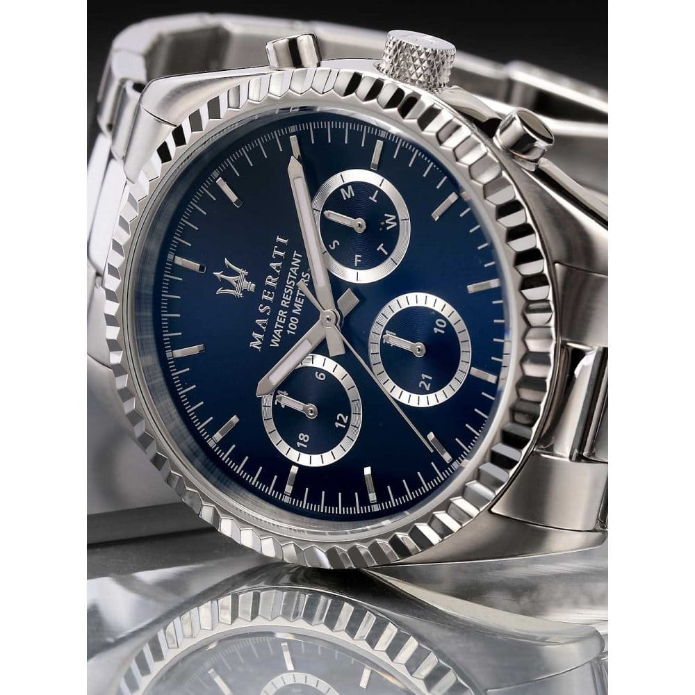 Stainless steel case with a stainless steel bracelet. Fixed fluted stainless steel bezel. Blue dial with luminous silver-tone hands and index hour markers. Minute markers around the outer rim. Dial Type: Analog. Luminescent hands and markers. Three multi-function sub-dials displaying: 24 hours, date and day of the week. Quartz movement. Scratch resistant mineral crystal. Screw down crown. Screwed case back. Round case shape. Case size: 43 mm. Case thickness: 11 mm. Band width: 22 mm. Fold over clasp with a safety release. Water resistant at 100 meters / 330 feet. Functions: chronograph, hour, minute, second. Competizione Series. Casual watch style. Maserati Competizione Chronograph Quartz Blue Dial Men's Watch R8853100022