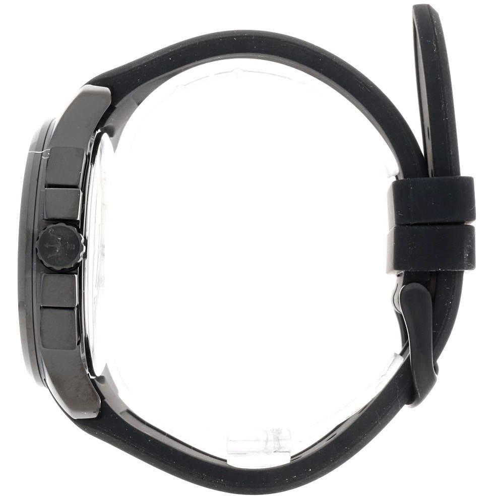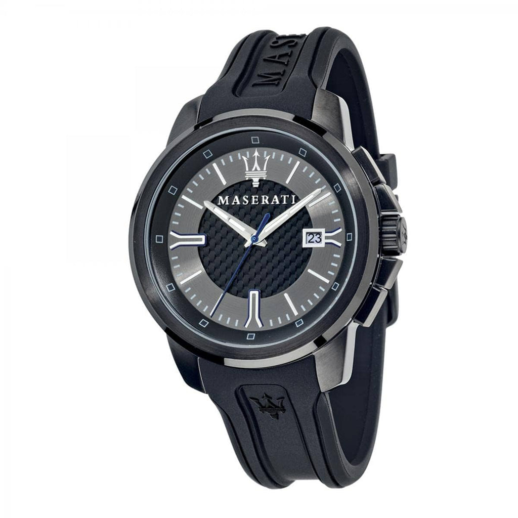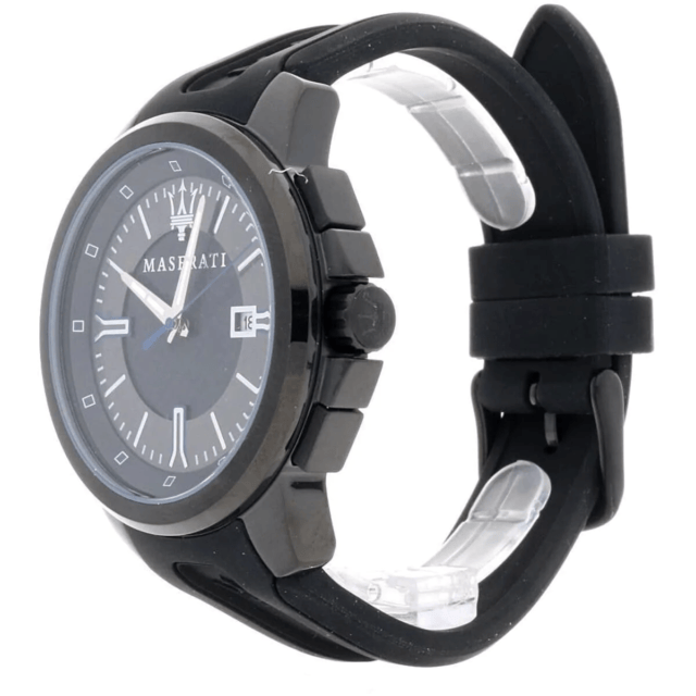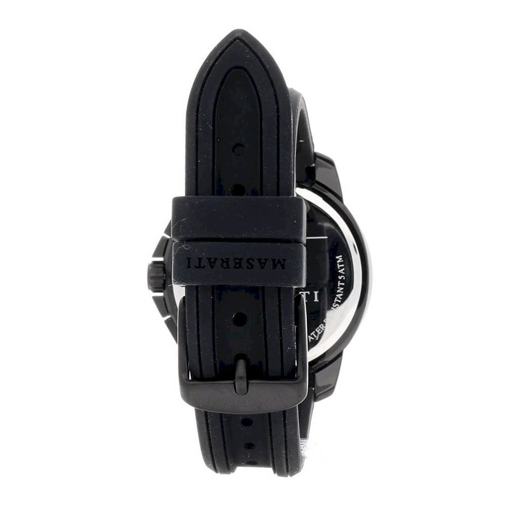Maserati men's watch with black dial, 44 mm diameter stainless steel case and rubber strap. Inside the case we find a quartz mechanism of high quality, protected by a mineral crystal. Water resistant to 5 ATM, suitable for daily use (shower, bath).
